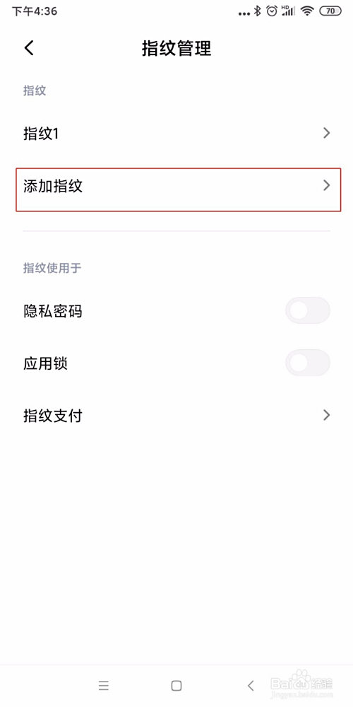 5.进入指纹办理界面,选择添加指纹,采集需要添加手指的数据。