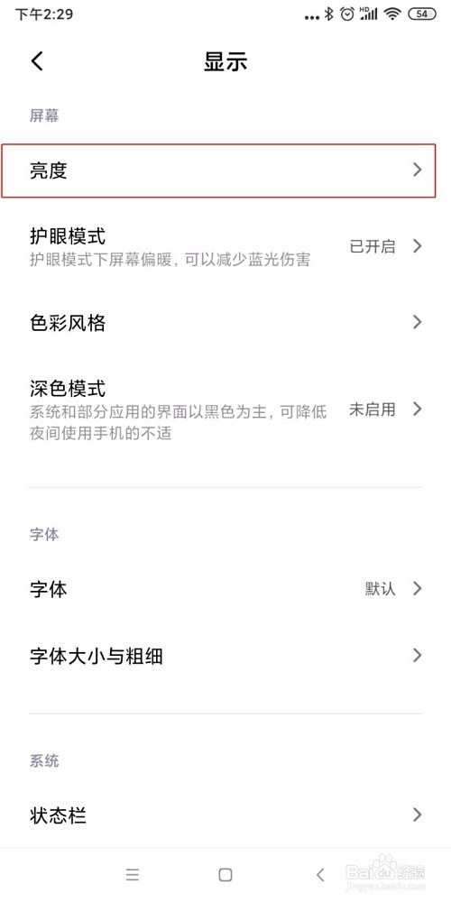 进入显示界面,选择亮度。如下图所示。