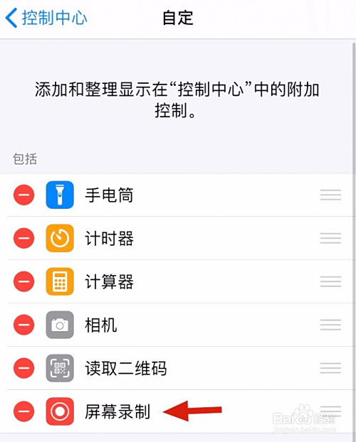 进入自定节制后,下滑屏幕找到“屏幕录制”选项,点击绿色➕。