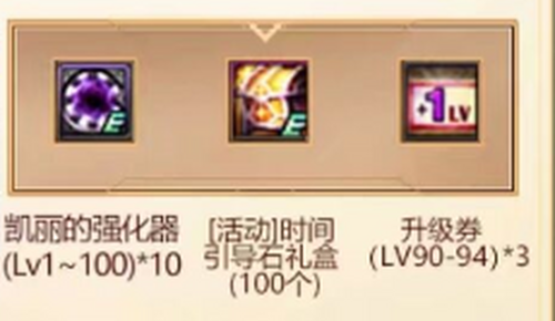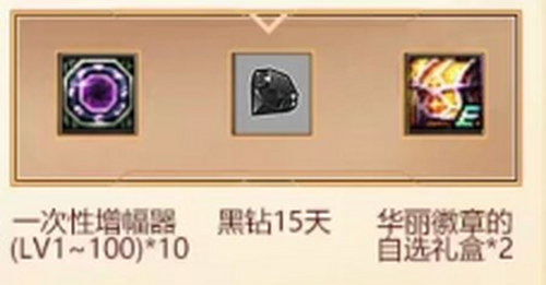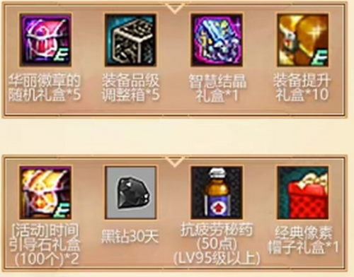 此次奖励总和为凯丽的强化器10个,一次性增幅器10个,装备晋升礼盒10个,黑钻45天,进级券(LV90-94)3个,指导石礼盒400个。富丽徽章那个自选礼盒2个,高级装扮兑换(无刻日),富丽徽章的随机礼盒5个,装备等第调整箱5个,聪明结晶1个,经典像素帽子礼盒1个。