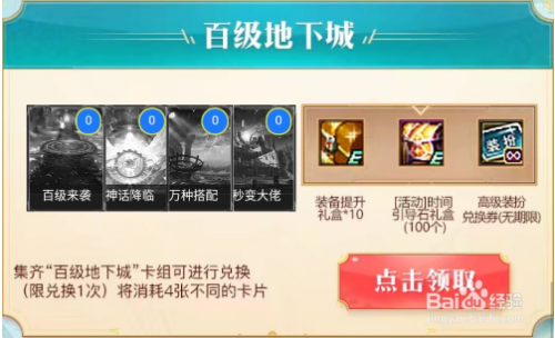 集齐“百级地下城"卡组可进行兑换,百级来袭,神话降临,万种搭配,秒变大佬,(限兑换1次)将耗损4张分歧的卡片。奖励为装备晋升礼盒10个,时候指导石礼盒100个,高级装扮兑换(无刻日)。(限兑换1次)将耗损4张分歧的卡片。