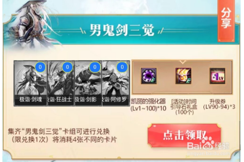集齐“男鬼剑三觉"卡组可进行兑换,极诣:剑魂,极诣:狂兵士,极诣:剑影,极诣:阿修罗。奖励为凯丽的强化器10个,进级券(LV90-94)3个,指导石礼盒100个。(限兑换1次)将耗损4张分歧的卡片。