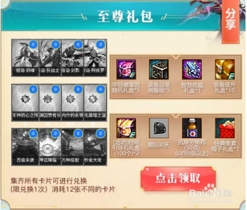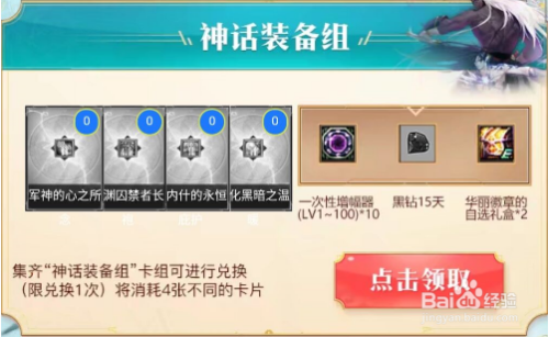 集齐“神话装备"卡组可进行兑换,军神的心之所念,深渊囚禁者长袍,伽内什的永恒呵护,融化暗中之暖和。奖励为一次性增幅器10个,黑钻15天,富丽徽章那个自选礼盒2个。(限兑换1次)将耗损4张分歧的卡片。