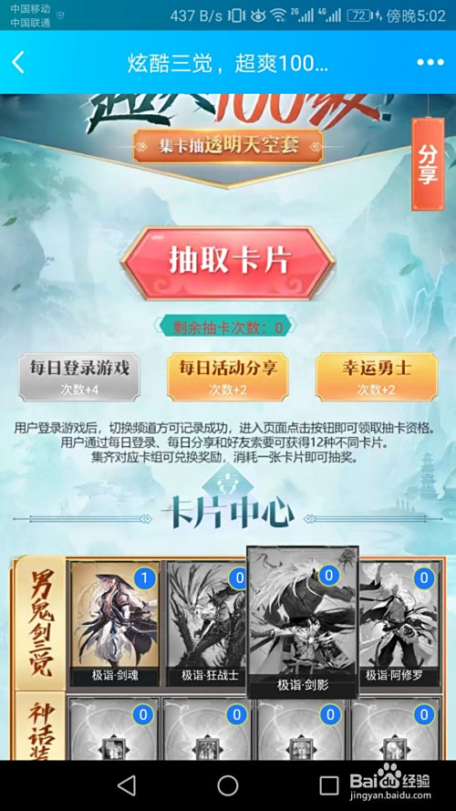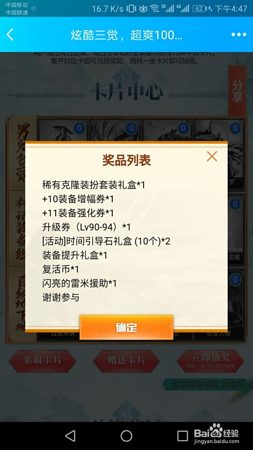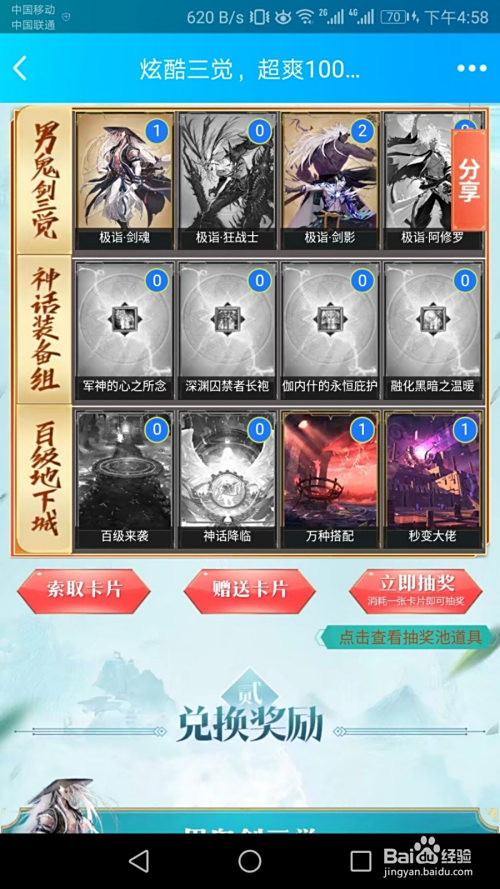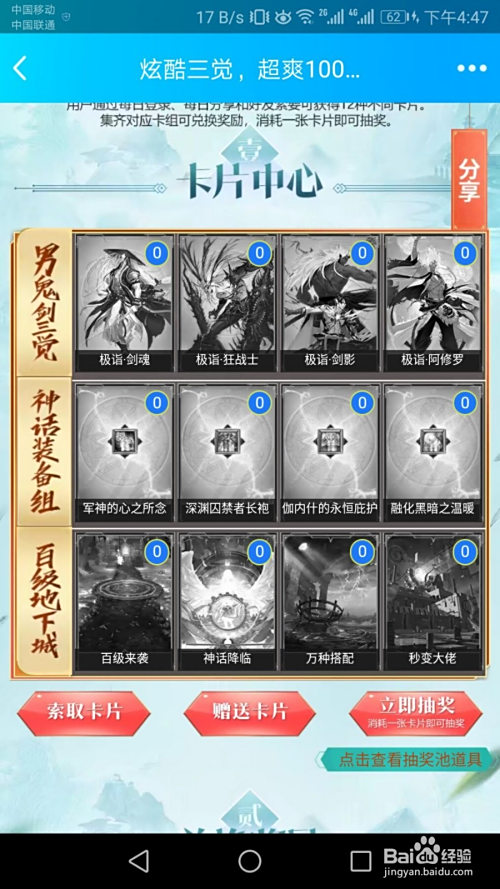一共有男鬼剑三觉、神话装备组、百级地下城3个卡组,每个卡组含4张卡片。每次抽卡将随机获得12张卡片中的1张,卡片会反复获得。可以经由过程老友赠予、索要的形式获得卡片,天天最多接管4次卡片。也可以耗损反复多余的卡片进行抽奖,需要先选中要耗损的卡片,再点击当即抽奖。