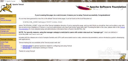 在浏览器中输入http://localhost:8080/浏览测试,若是能看到如下所示的页面,申明Tomcat能正常工作