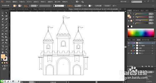 利用钢笔画出城堡的尖顶与旗号,再用矩形画出城堡的窗户与大门的根基路径,接着,我们画出城堡的本家儿体布局件的路径。