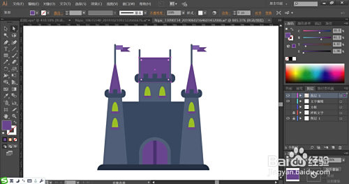 接着,我们再来画一画别的的一个城堡,我们先用钢笔画出城堡的三角形本家儿体布局,再用矩形与圆形画出城堡的中心布局路径。最后,我们用蓝黑色、紫色、绿色搭配填充城堡的本家儿体、大门、窗户等布局件,完当作城堡图片设计。