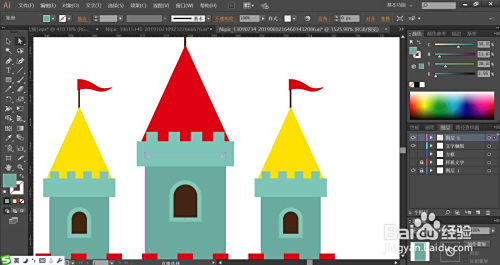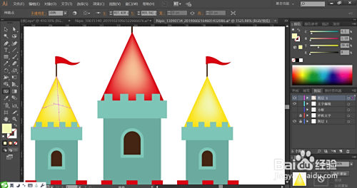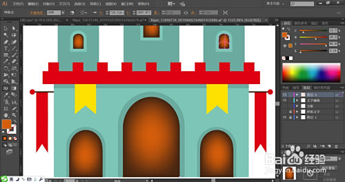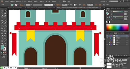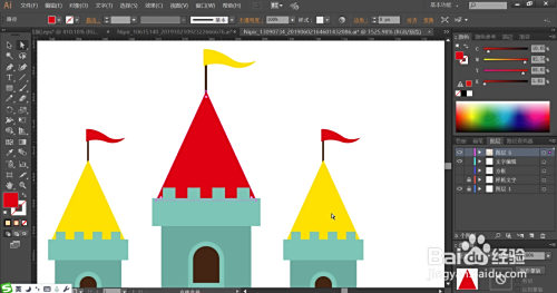利用红色填充城堡上基层之间的墙壁布局件,再用黄色与红色填充墙壁上方的旗号路径。