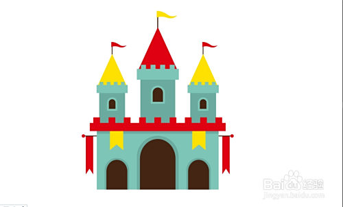 利用红黄色搭配填充城堡的尖顶与旗号的路径,旗杆用灰黑色填充。