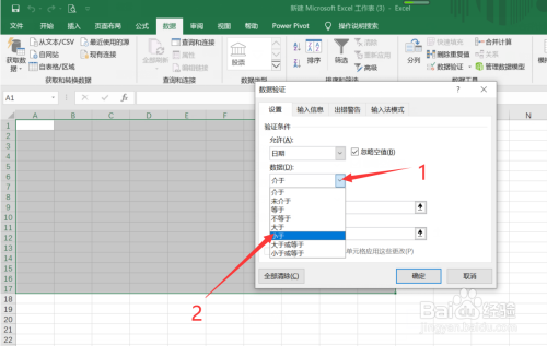 第三步:点击【数据】下方空格右侧的下拉箭头,选择【小于】