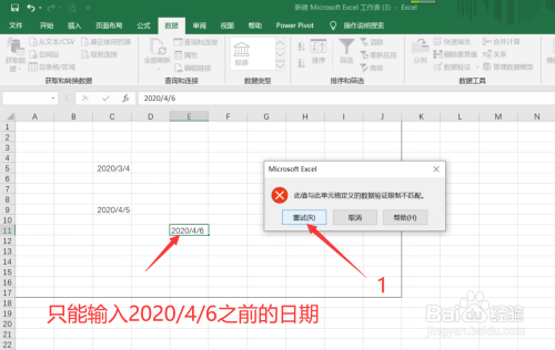 5、这样就只能输入2020/4/6之前的日期了,点击【重试】