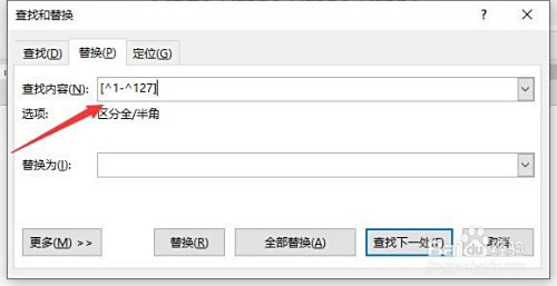 打开“查找和替代”对话框后,在“查找内容”文本框中输入“[^1-^127]”合适,连结“替代为”文本框的空白状况。