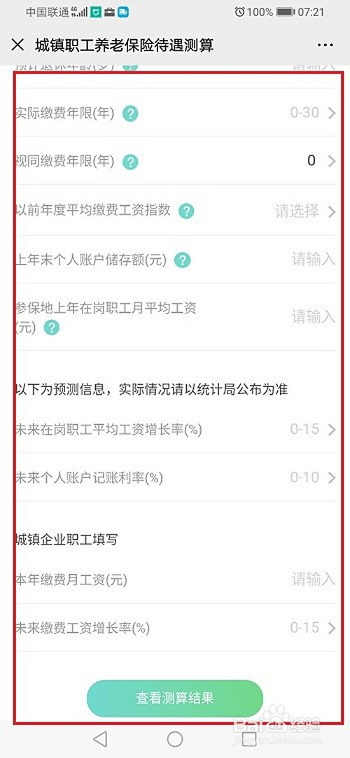 第五步进去养老金测算界面,输入信息,就可以测算养老金了,如下图所示: