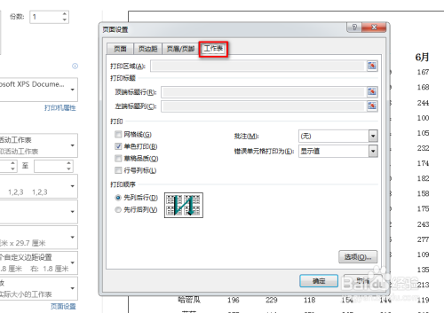 这时点击“页面设置”,然后会弹出一个对话框,接着,点击“工作表”选项卡,具体如图所示:
