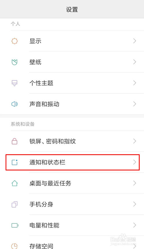第二步:点击通知和状况栏