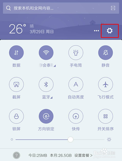 第一步:用食指从手机屏幕顶部往下滑,然后点击右上角的设置按钮