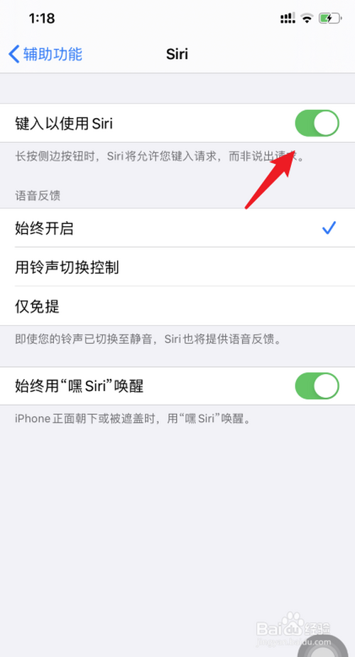 在Siri设置中,将上方的键入以利用Siri的开关打开后测验考试。