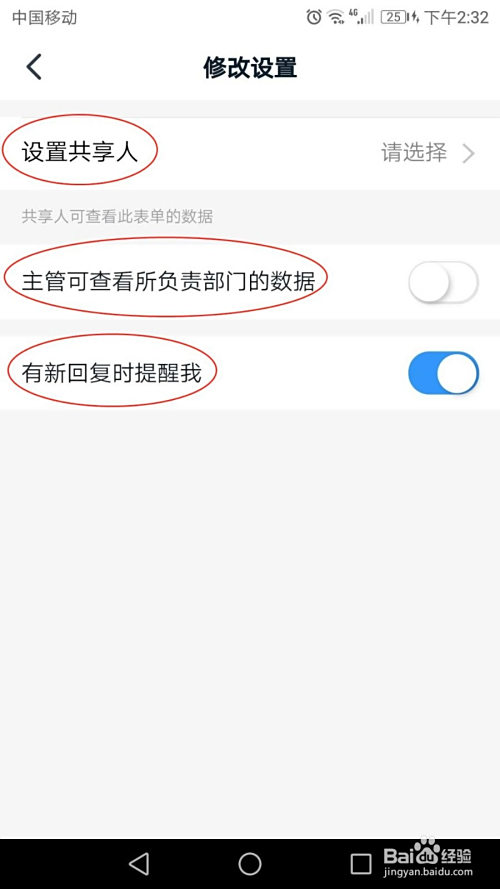 进入“点窜设置”界面,按照小我需要“设置共享人”,开启或封闭“本家儿管可查看所负责部分的数据”、“有新答复时提醒我”等功能。
