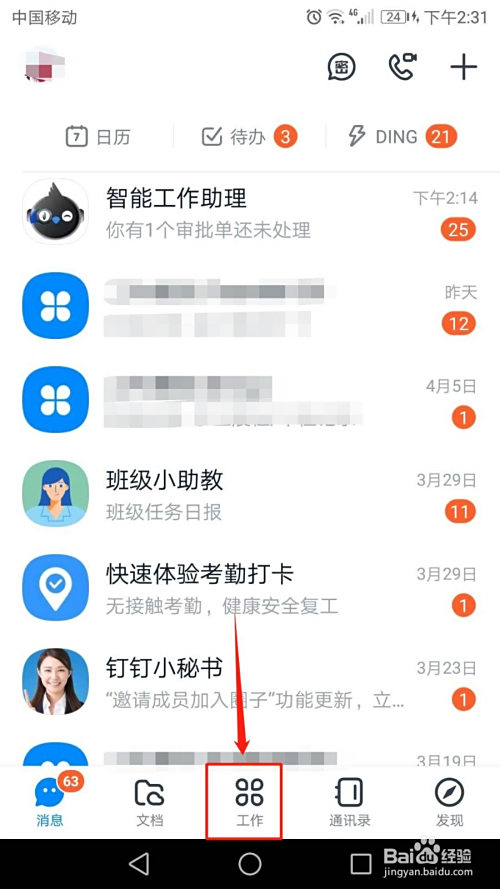 进入手机钉钉,点击页面底部“工作”选项卡。
