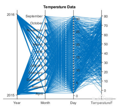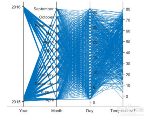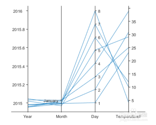 %将 ParallelCoordinatesPlot 对象赋给变量 p,以便在建立画图后利用 p 进行点窜。