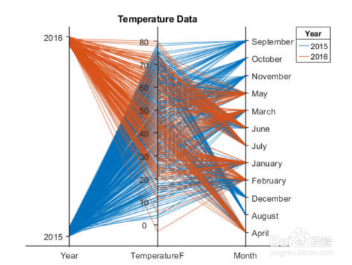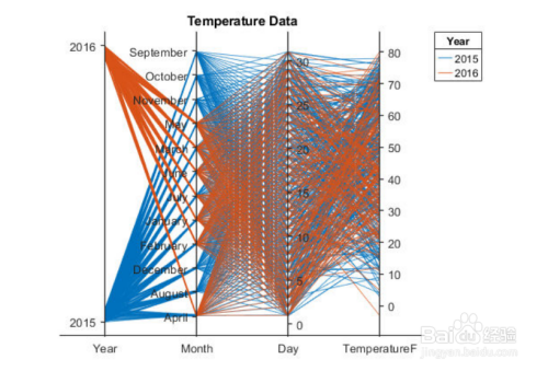 具体操作是从画图中删除 Day 变量,并将 TemperatureF 变量(源表中的第四列)显示为画图中的第二个坐标轴。