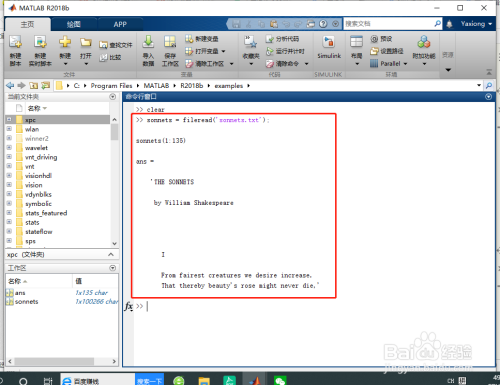 %利用 fileread 函数从莎士比亚的十四行诗中读取文本。