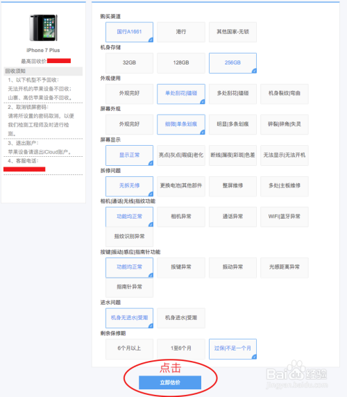 点击iPhone 7 plus进去之后,按照iPhone根基设置装备摆设和选择完所有的评估选项当即估价收受接管价钱就评估出来了。