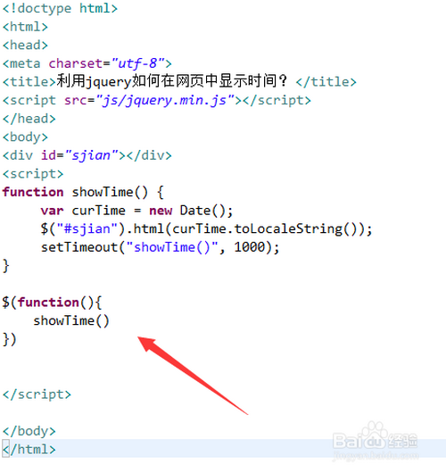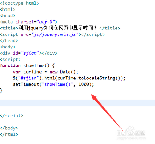 2、在js标签内,建立一个showTime()函数在函数内,利用“new Date()”获适当前时候,经由过程id获得div对象,利用html()方式将获得的时候输出来,再利用setTimeout()方式,每隔1秒执行一次showTime()函数,实现时候按秒数一向转变 。