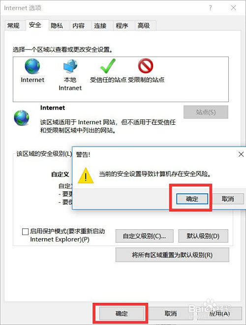 在Internet选项页面点击【确定】,会再弹出警告窗口,点击【确定】,重启IE浏览器安装 ActiveX 控件就可以了