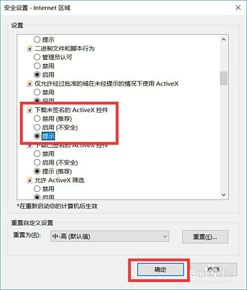 在列表找到【下载未签名的ActiveX控件】,选择【提醒】,点击【确定】