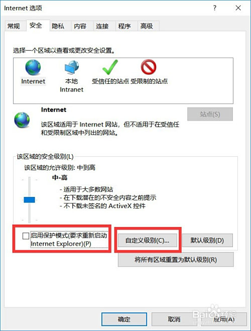 打消勾选“启用庇护模式”,点击【自界说级别】