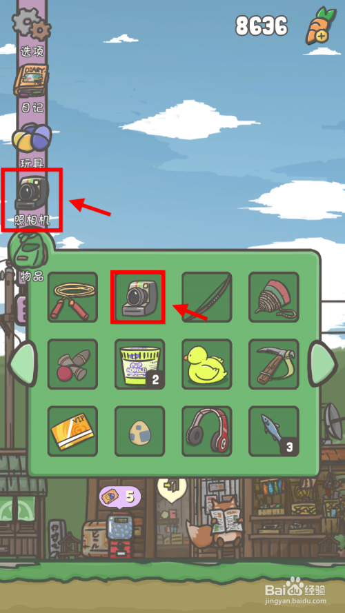 2、拍照机买下来后,在背包中和菜单栏城市呈现1个拍照机图标。