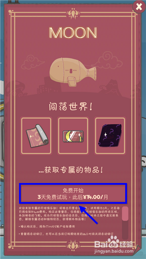 4、点击moon,ios版月兔冒险可以免费试用3天,后续14元1个月。