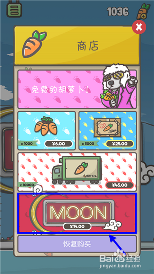 点击moon,ios版月兔冒险可以免费试用3天,后续14元1个月。安卓版也是从这个界面进去,破费5000根胡萝卜当作为月球俱乐部会员。