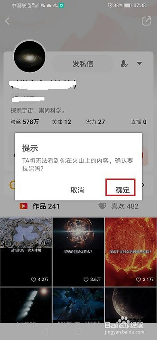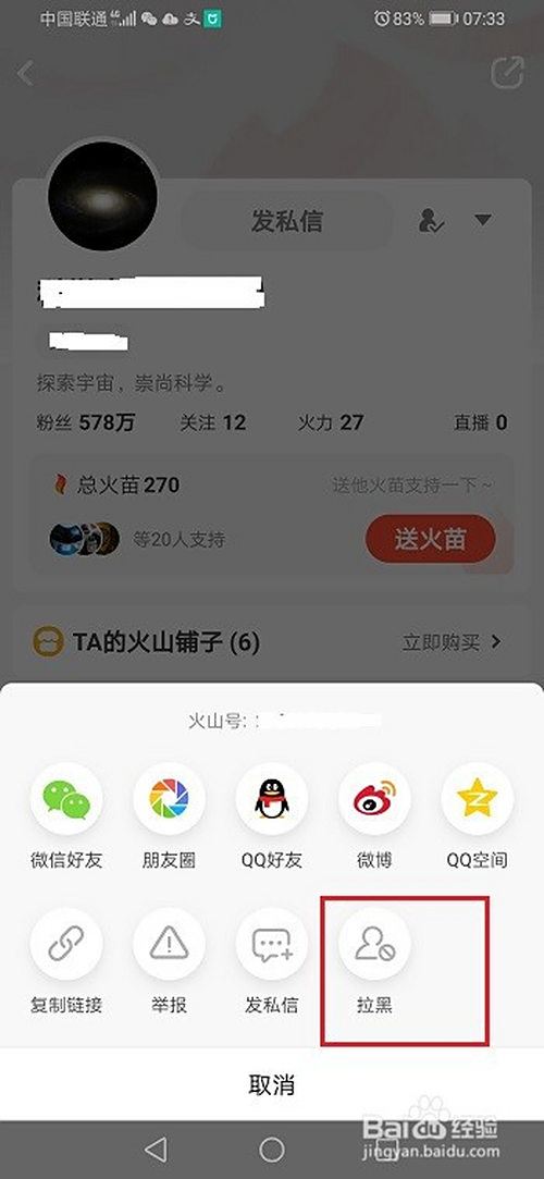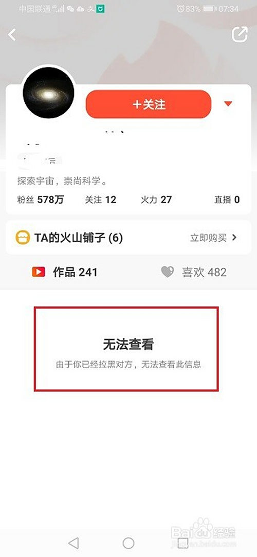 第一步打开抖音火山版,登录账号进去,找到要拉黑的人,如下图所示:
