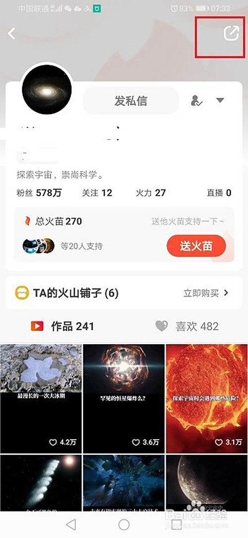 第二步进去抖音火山版上对方的本家儿页之后,点击右上方的分享图标,如下图所示: