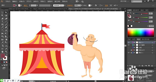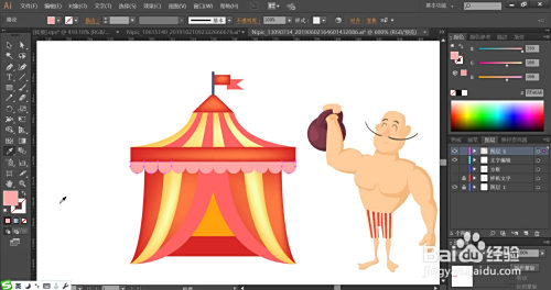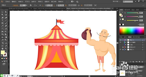 最后,我们用淡粉红色填充帐篷正面顶端的半圆形垂帘,帐篷底部用大红色填充暗光路径,完当作鼎力士人物画设计。
