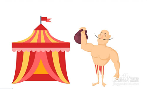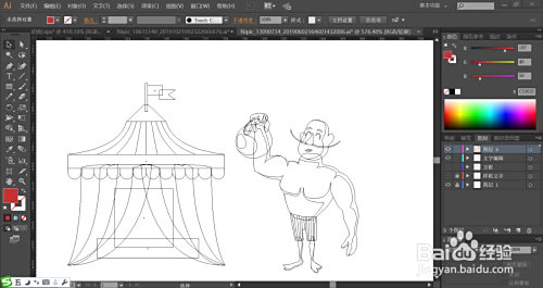 利用钢笔车出大大的帐篷的细节,包罗顶端的旗号与正面的小门,再画出右侧鼎力士的举重动作,画出他的脸色与手里的圆球的细节路径。