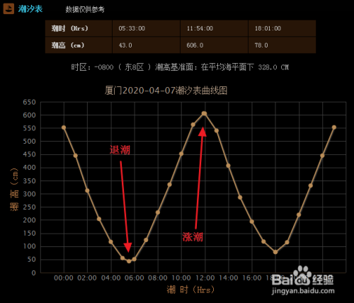图上可以看出涨潮与退潮的时候,以及潮汐的高度值。