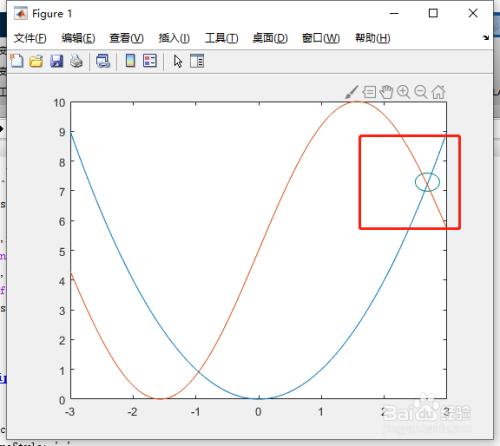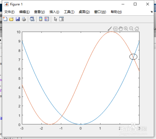 %在图中添加一个圆圈,以凸起显示 f(x) 等于 g(x) 的位置。要建立圆圈,请利用 'ellipse' 选项作为注释类型。