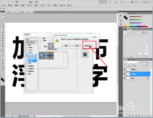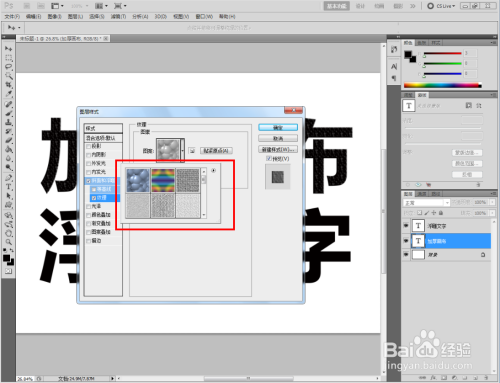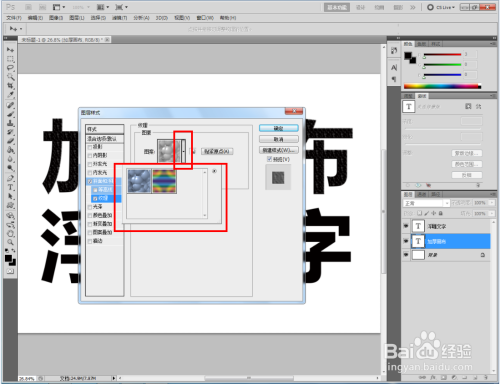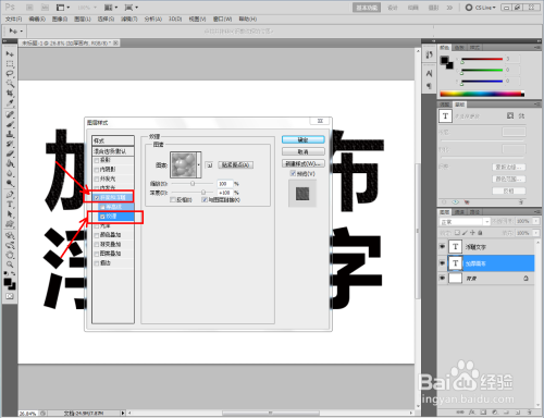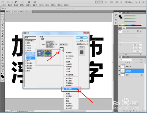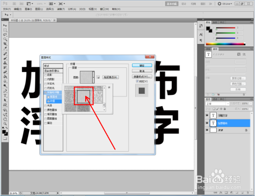 双击图示文字图层,弹出图层样式设置栏。勾选【斜面和浮雕】-【纹理】,点击图示小三角,弹出图案选项栏;