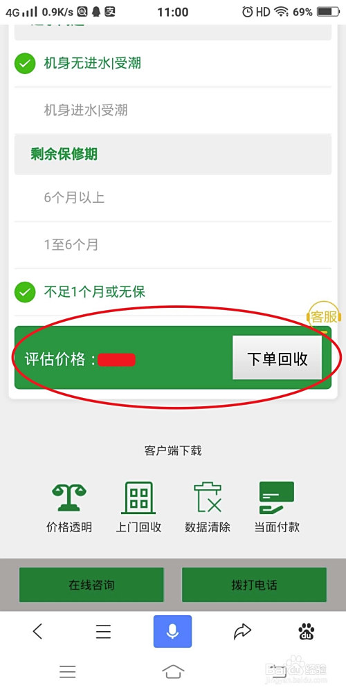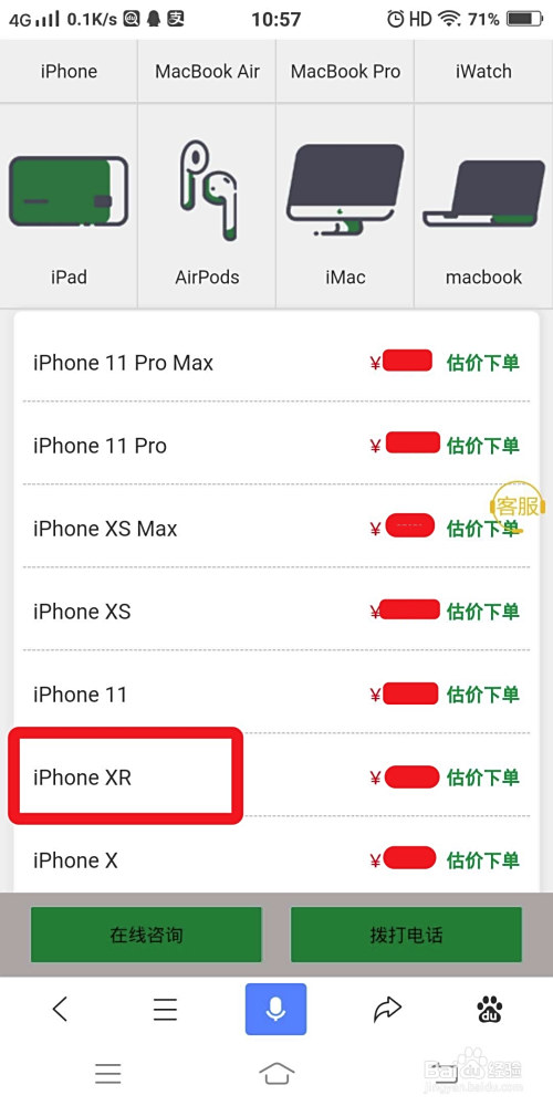 点击iPhone XR进去之后会有10项选择项,按照iPhone根基设置装备摆设和利用环境选择完所有的评估选项评估价钱就出来了。