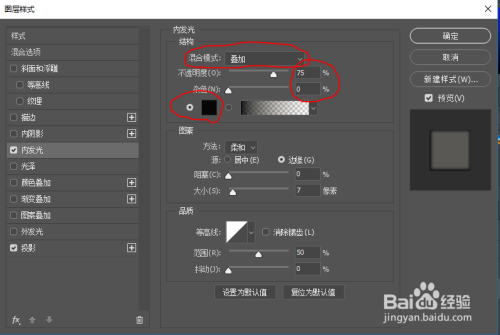 选中新建的图层1,点击图层底部的“添加图层样式”按钮,选择“内发光”,相关设置如下: