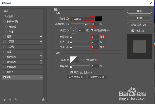 选中新建的图层1,点击图层底部的“添加图层样式”按钮,选择“投影”,如下: