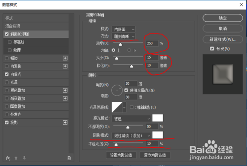 选中新建的图层1,点击图层底部的“添加图层样式”按钮,选择“斜面和浮雕”,相关设置如下: