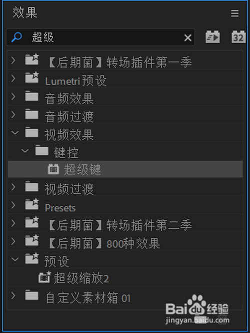 在结果栏搜刮“超等键”,拖拽到绿幕素材上。