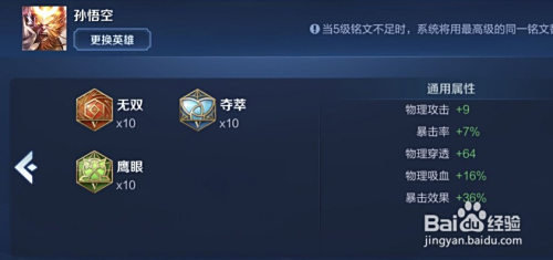 起首,铭文选择:无双*10,夺萃*10,鹰眼*10,供给暴击和吸血