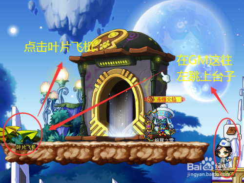 在GM这往左跳上台子,不要管中心的传送门,移动到台子最左边点击叶片飞机。