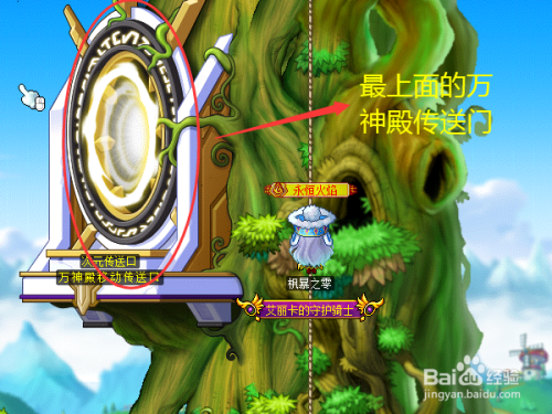 然后沿着屏幕中心的绳索网上爬,,找到三个传送门中最上面这个传送门,就是前去万神殿的传送门。