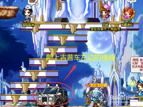 达到万神殿诺巴的圣域后往左走一点,看见责物公园吉普车左边有个楼梯,爬上去,移动到冒险岛GM边上。
